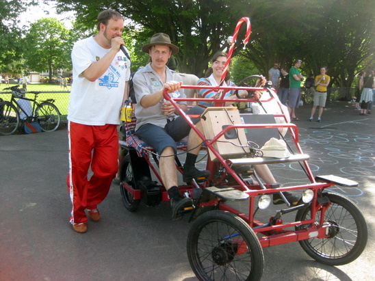 In a series of events, participants will display their skill and style in the arena of family biking. One event will be an obstacle course for parents and children (on their family bike setup, whatever it is: Xtracycle, bike seat, trail-a-bike, solo bikes, tandems, bakfiets, etc.). In another, kid riders 5-12 will compete in a cyclocross-style competition. In a third, mother and kid duos will compete in an exhibition event, like ice skating, with a number of required elements and room for uniqueness. A few more events may be added if time and organizer energy allows. Kids required!