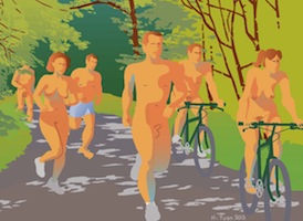 Fun ride in the sun, celebrate body freedom, bring body paint for self expression and messages. Clothing optional. This is the biggest day-time nekid ride. We'll ride through all five quadrants of Portland. Busy streets, quiet streets and paths. Ends at the Fig Leif Naked Ride/Run