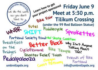 Bike decorating and bike riding! (All humanpowered-wheels welcome ie scooters, boards, trikes!) We are excited to host a balloonarific family friendly bike parade!! We WILL have a supply of balloons for decoration but please bring some more if you'd like--or tips$ for twisters. Lippman Co. is just 2 blocks away for supplies if you need. We'll start at Eastside & Salmon, head north to cross the Steel Bridge, around the round-a-bout on the other side at Waterfront Park, and then back. Ride is 3 miles. Young able riders encouraged to ride but must be accompanied by a guardian. When the ride is complete if riders wish to keep going we can ride south past OMSI and over the Tilikum for fun too! Bring water and Tunes. Party on!