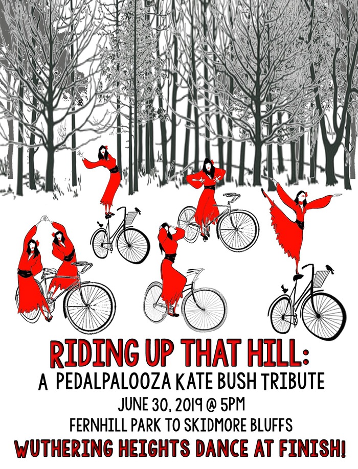 Welcome to the Kate Bush Tribute Ride, an ode to England's national treasure herself. We hope to bring together stateside fans of this genuine auteur. Despite what the name says, there may or may not be hills on this route. But even so, if I could make a deal with god, I'd get him to swap our places. The ride will end out on the wiley, windy moors of the Skidmore Bluffs, where we will engage in a group recreation of Ms Bush's iconic "Wuthering Heights" dance. All riders are welcome to join, either as a participant or a spectator. Pack a red dress for the big finale!