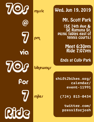 Pedalpalooza is here! Meet at Vera Katz Eastbank Esplanade wheels rolling at 7:30 ~10 miles at 10-12 mph; no drop. Bring snacks, beverages and other consumables. Will be two stops, one for a beer/bathroom and one to restock before a fire by the river near the starting location.