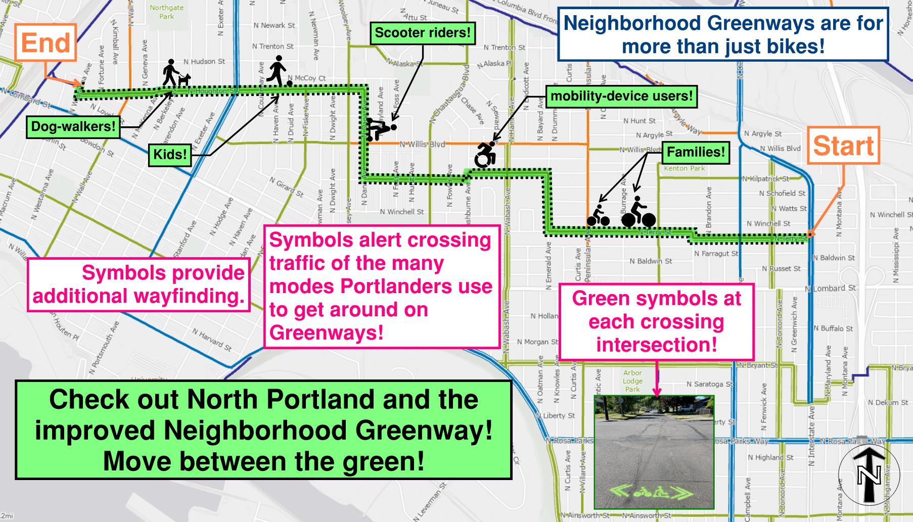 North Portland in Motion is an planning effort to identify transportation needs and near-term investments to improve access to community destinations and support walking, biking, and transit use in the North Portland peninsula. Join neighbors and PBOT staff for a Kickoff Ride starting this planning process that will define how folks access Transit, walk and roll in your neighborhood for the next generation. Get a snapshot of how people move around the Peninsula now and envision how people can move around the Peninsula tomorrow! We will take a Spin around the Peninsula, staring at Overlook, heading up to St Johns where we'll take a break before heading back to Overlook by way of Kenton. Check out the map of the ride! Each color represents one 'leg' of the ride. Between each leg we'll take a brief pause for people to join up or peel off in the neighborhoods. Through North Portland in Motion, PBOT will: Engage deeply with North Portlanders to understand transportation needs and barriers to meeting daily mobility needs. Identify a near-term prioritized investment strategy of projects and programs to improve conditions for walking, biking, and transit. Build new relationships with community-based organizations to represent the diverse neighborhoods and communities within North Portland. Project info: https://www.portland.gov/transportation/planning/construction/north-portland-motion