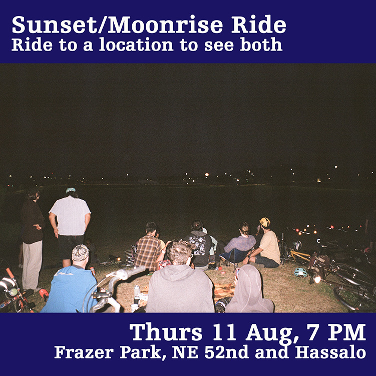 pedalpalooza is so special! and biking is such a vastly different experience alone vs. with a couple friends vs. with a huge crew. and community is so vital, yet nebulous, slippery... it makes you think. even together, are we alone? or when alone, do we remain together, in solidarity? do words mean anything? what is time? lol but srsly - come hang out and bike with us, silently - as if alone - but together! this winding, high-focus route (around 10 miles) features some light off-road riding. also: hidden, strange, scenic, occasionally eerie perspectives. be here now with us!