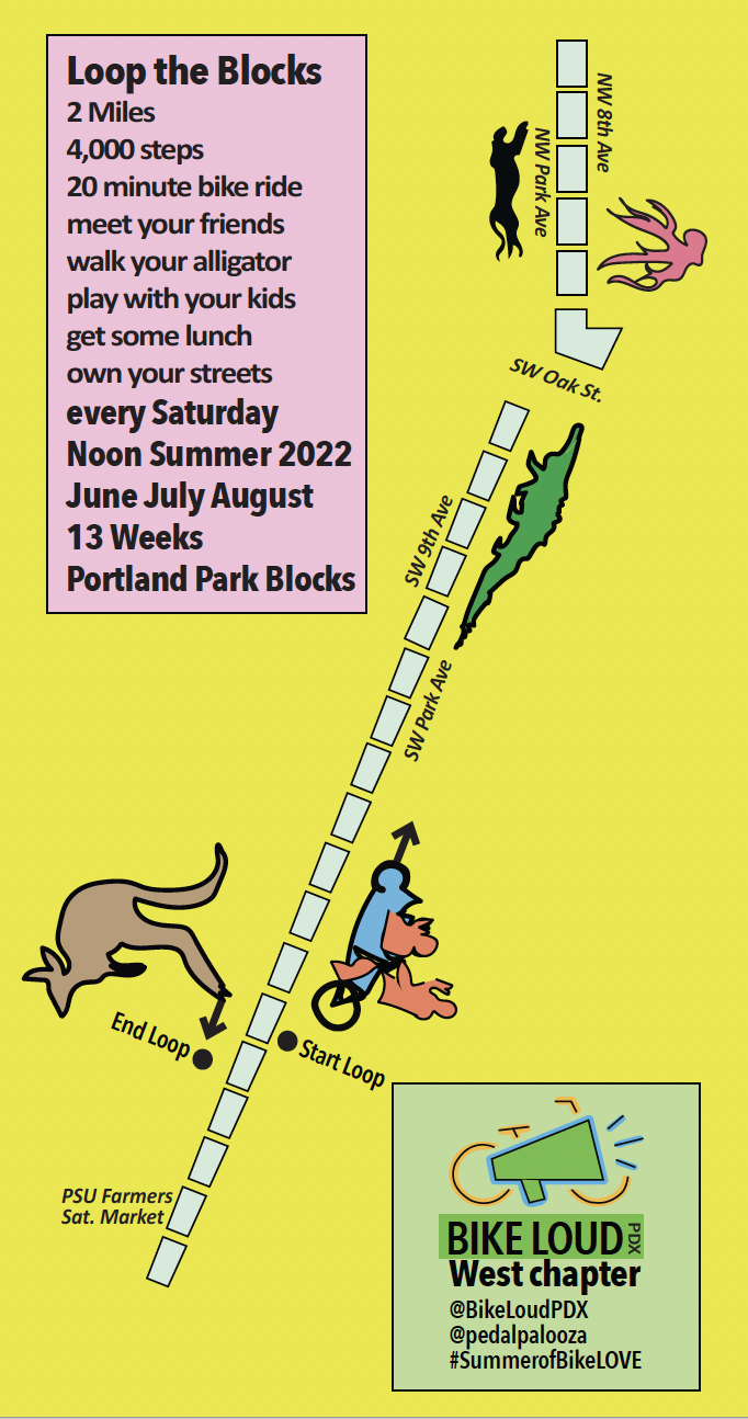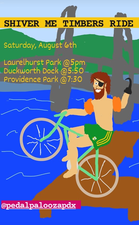 Who's ready for a full summer of bike fun? This is the big ride that kicks off the festivities every year. Bring yourself and your bike to the kick off location where volunteers will be selling Pedalpalooza merch from 5-5:45PM. We'll depart at 6:00PM on a family-friendly cruise, lasting about 45 minutes. You are encouraged to dress yourself and your bike up. Immunocompromised community members, listen up! If you'd like to ride with other masked cyclists, meet on the north side of the pond where there will be someone drumming. Our volunteers will help you get to the front of the ride. We'll leave from the bathrooms heading west on the northern trail towards SE Ankeny St and taking Ankeny to SE 6th Ave. Then heading north to NE Couch St. back westward to connect to the Burnside Bridge. Once over the bridge, we'll take right turns to get onto SW Naito Parkway and take that to NW Overton St. We cross the tracks three times, so please be careful! Ride will pause at The Fields Park and then you have options: 1) Hang at The Fields Park with DJ Carlos who will then slow roll to Colonel Summers 2) Make your way to Beaverton by MAX or bicycle to meet up with the Westside Wednesday Ride. See separate calendar entry for details See route details here: Kickoff Ride (the ride go from Laurelhurst to The Fields Park, as shown here, and then head to Colonel Summers after the Smashing Westward crew speeds off on their adventure) - Family Friendly - https://ridewithgps.com/routes/39569154 Smashing Westward - definite drop ride out to Beaverton Transit Center to meet up with Westside Wednesday Ride - https://ridewithgps.com/routes/39569208 Westside Wednesday - no drop ride from BTC to Colonel Summers Park - https://ridewithgps.com/routes/39569331