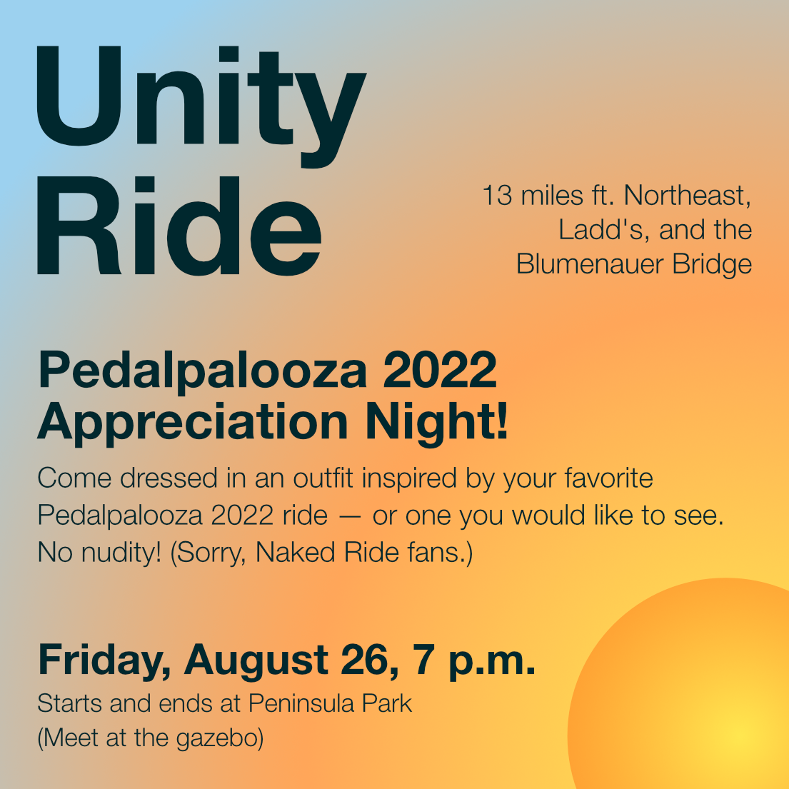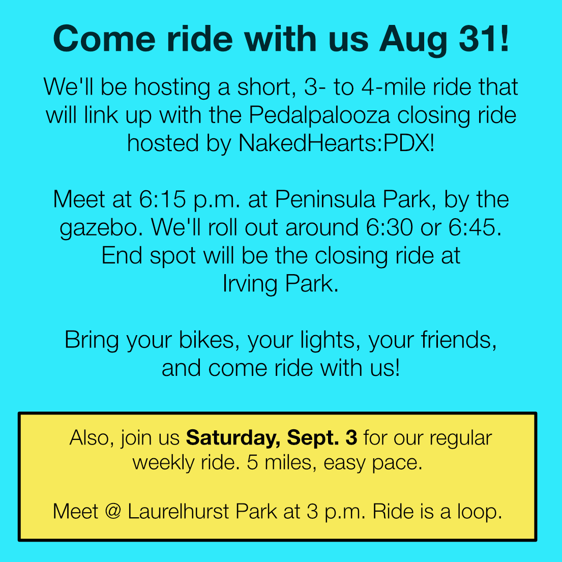 Can you believe that Pedalpalooza is just almost over? Neither can we. But we wanted to squeeze in one last ride before it ends! So join us WEDNESDAY NIGHT for this short but sweet ride through North and Northeast Portland! We’ll ride roughly 3 or 4 miles before joining up with NakedHearts:PDX's Pedalpalooza Closing Ride at Irving Park. ***This is NOT a naked ride. No nudity.*** Meet up at Peninsula Park, by the gazebo, around 6:15. We’ll roll out around 6:30. Bring some friends, a snack, some water, your tunes, and your lights, and come hang with us! ----------- P.S. Also check out our regular ride this Saturday, Sept. 3, at 3 p.m. It's a 5-mile loop beginning and ending at Laurelhurst Park. ----------- RIDE RULES: • No bigotry, hate, discrimination, or harassment of any kind. No exceptions. • Riders under 18 must be accompanied by a responsible adult. • Respect the boundaries of others. Ask for consent when appropriate. • Be mindful of the space you take up. This is a shared space, so consider the comfort and safety of others. • Ride safely. Watch for cars, pedestrians, and other cyclists. Warn others of obstacles that you spot. • Have fun!