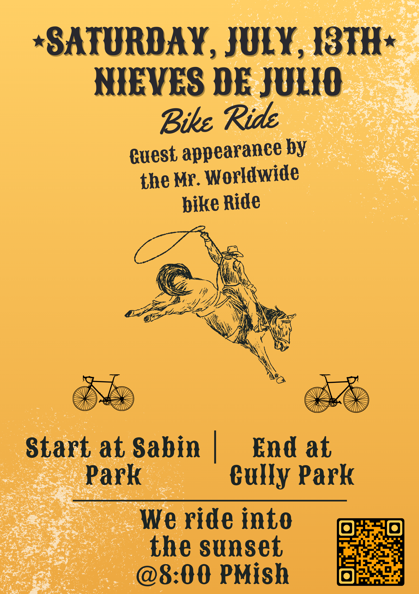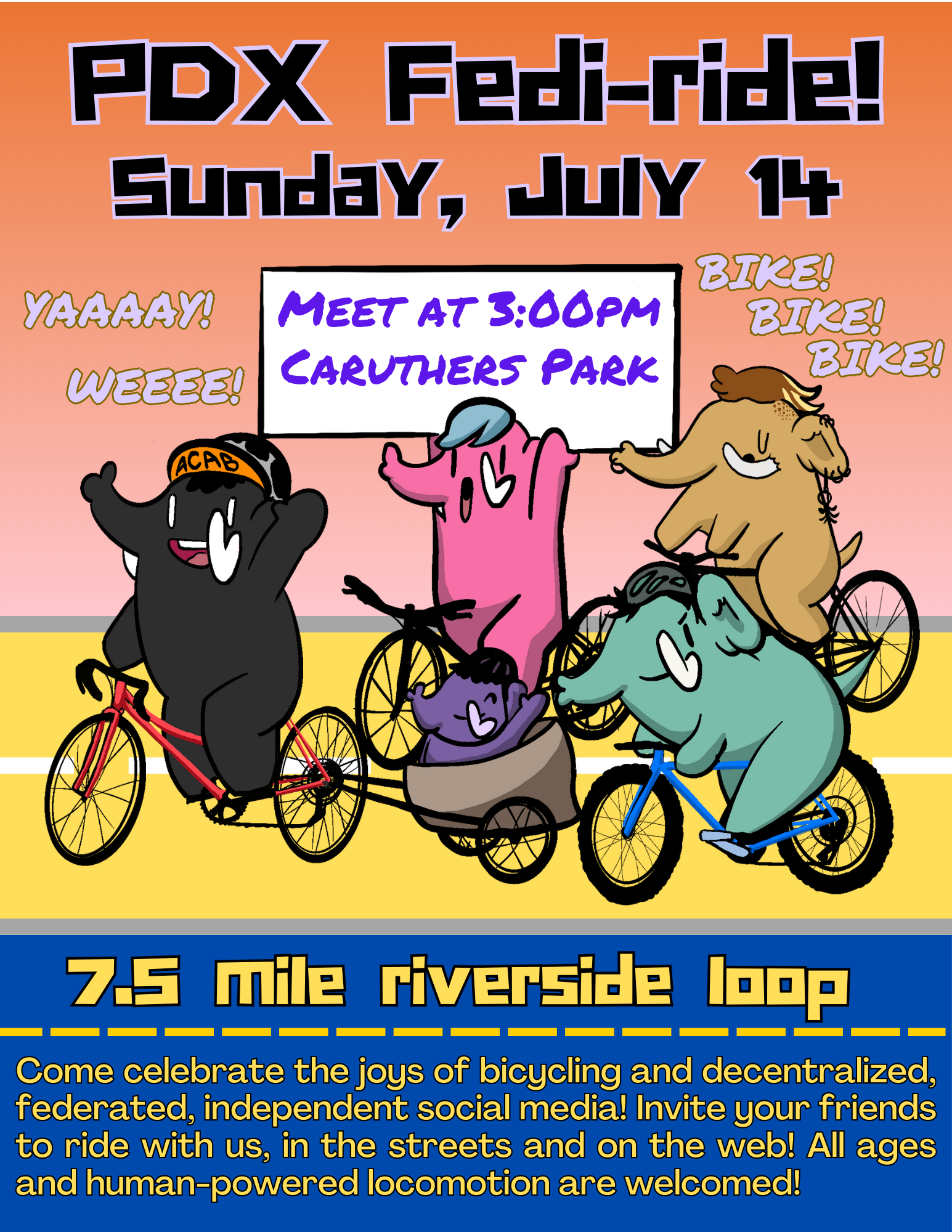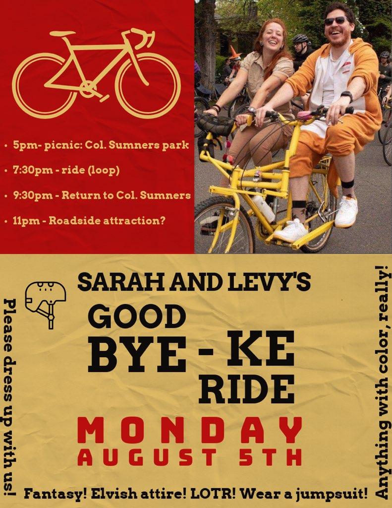 This is going to be a wild bicycle adventure and party. Let’s create something new. Let’s bike and slow down some cars and laugh and do some crazy shit. All music is welcome during riding part of ride. NO MOTORCYCLE ISH THINGS/ Electric one wheel things / thanks! Be respectful, responsible and mindful. We will stop the ride if you are being an asshole.