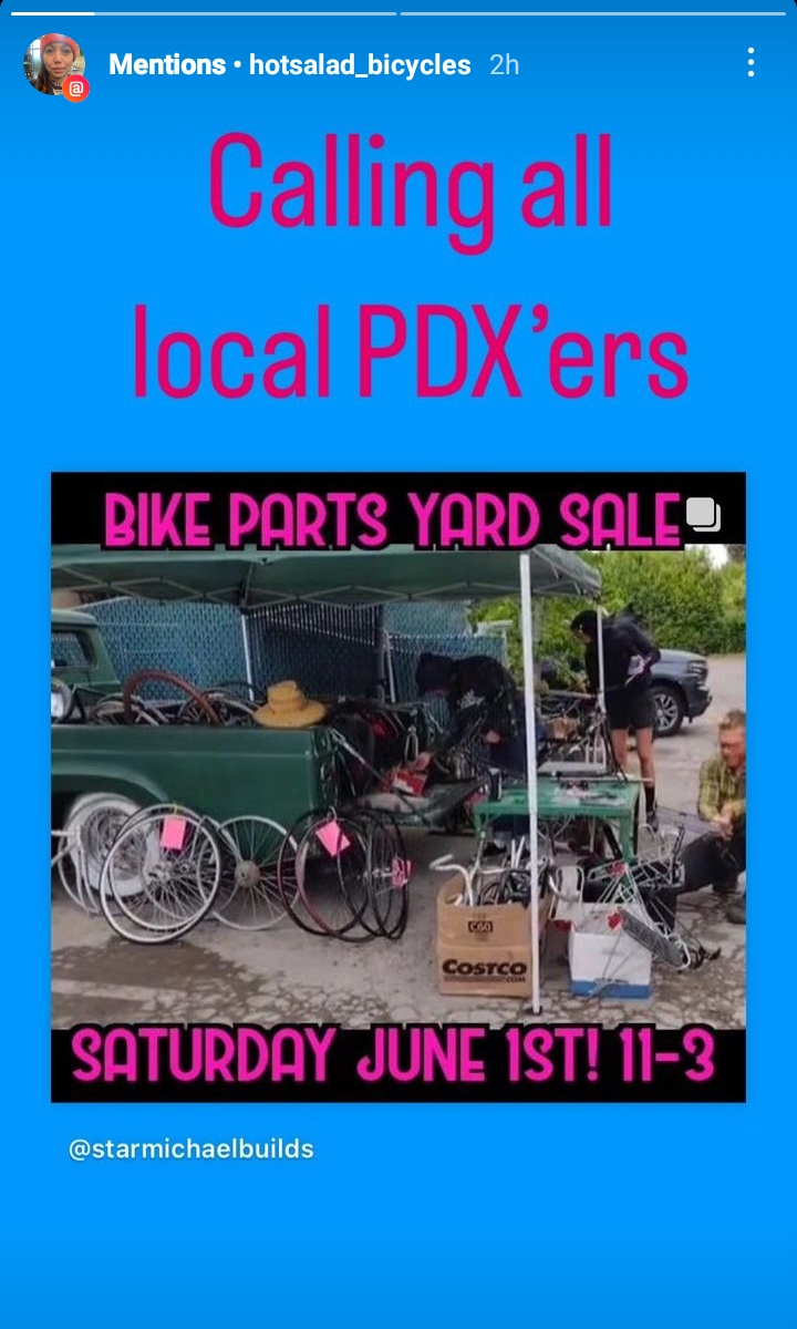 Alright people, I'm doing another big bike parts yard sale! Cleaning out the storage unit and thinning out the spare parts! I got a ton of good stuff for sale cheap! Most of it at garage sale prices! Most of the rest still pretty cheap! Only a little bit of it at swap meet prices. Almost nothing at craigslist or marketplace prices. Like maybe 1 thing at eBay prices! Huge free pile too! We're talking next Saturday morning! June 1st! We're talking 11am to 3pm or later if people keep showing up and wanting to hang out! Right next to Creston school/park on the corner of SE Bush and 49th. Can't miss it! No early birds I need time to set up, sheesh! Unless, you want to set up and sell stuff too, then show up early! I've got several nice old frames from 49cm-62cm, several nice old wheel sets, tons of bars and stems and seatpost and brakes and levers and tires and racks and bags and all sorts of bobs and bits! Most of this stuff needs to go away so I'll be taking offers on my already super cheap prices! Hey bike friends!?!?! 😎 😁 There's plenty of space so if you know me and want to drag a few loads of your junk down too and sell it swap meet style feel free! We'll probably order Domino's or something! It will be great! I got a boom box and a bunch of CDs so we'll probably be listening to music, like the best of the Beach Boys, or Bangles, or Iron Maiden or something fun, or Black Flag. IDK we'll see where the mood takes us!