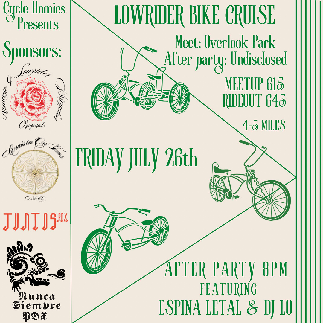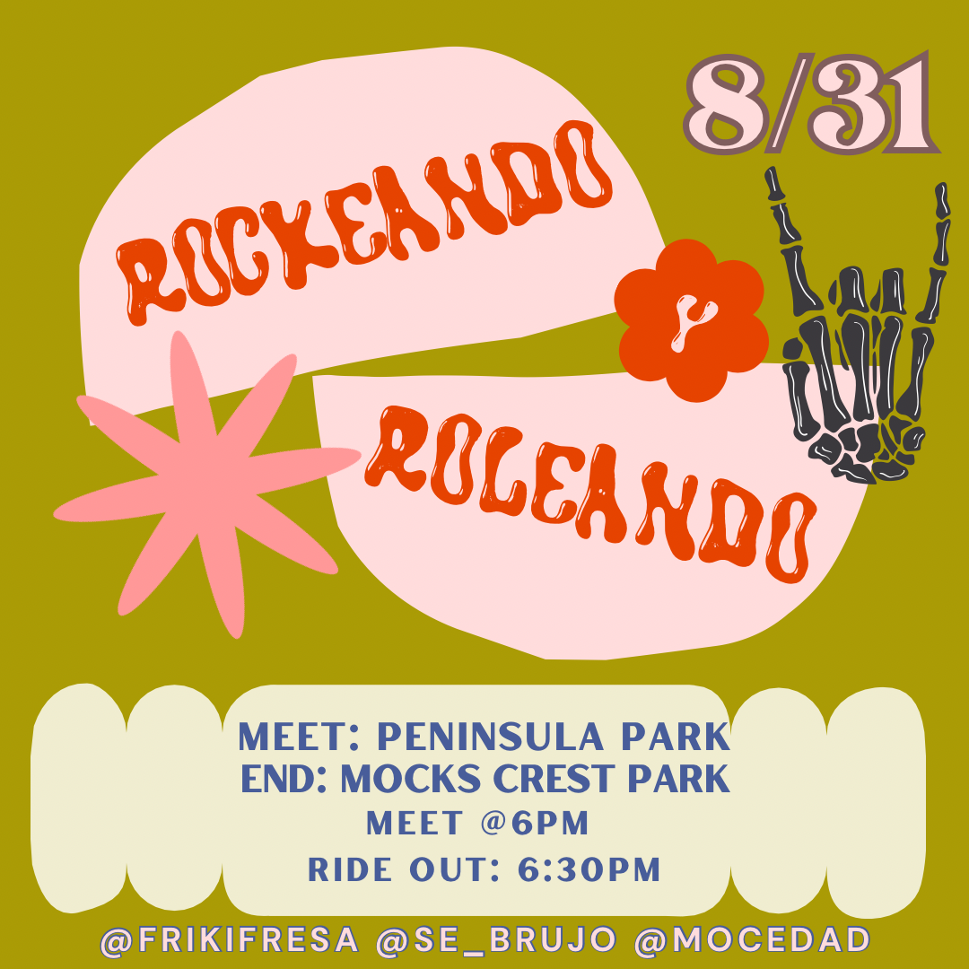 Come join us on a ride while we listen to some rock en español!!! We’ll be riding about 8 miles. Bring lights and water :) Feel free to bring your own speakers as well!! Bonus points if you rock your best rock en español band tee 😎 Beginner friendly, all wheels welcomed. Safe space, no hate tolerated. puro amor y paz✌🏽 ‼️Meeting time is 6pm and ride out is 6:30pm‼️