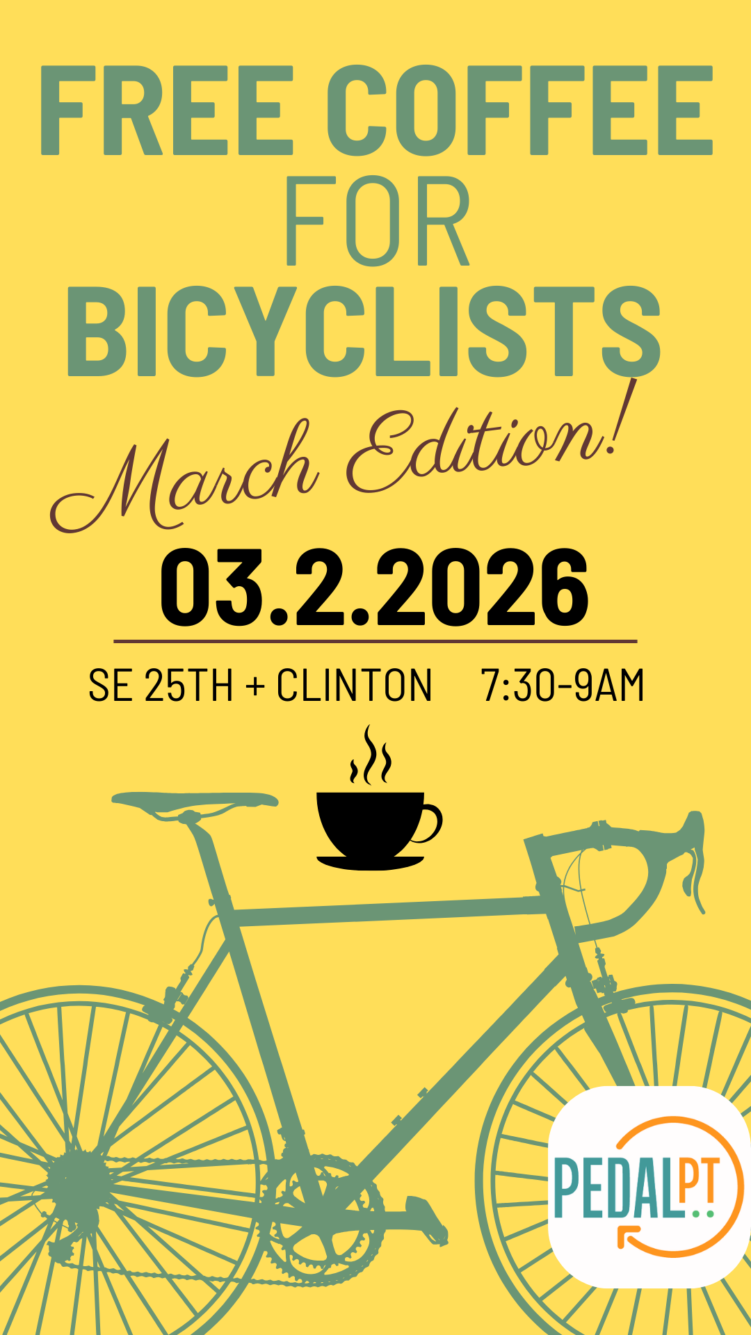 It's that time of the month for our Free Coffee for Bicyclists to brighten + caffeinate your morning bike commute down SE Clinton— Come join us on Monday 3/2 for free coffee, high fives, and good vibes with the Pedal PT team on SE 25th and Clinton.
