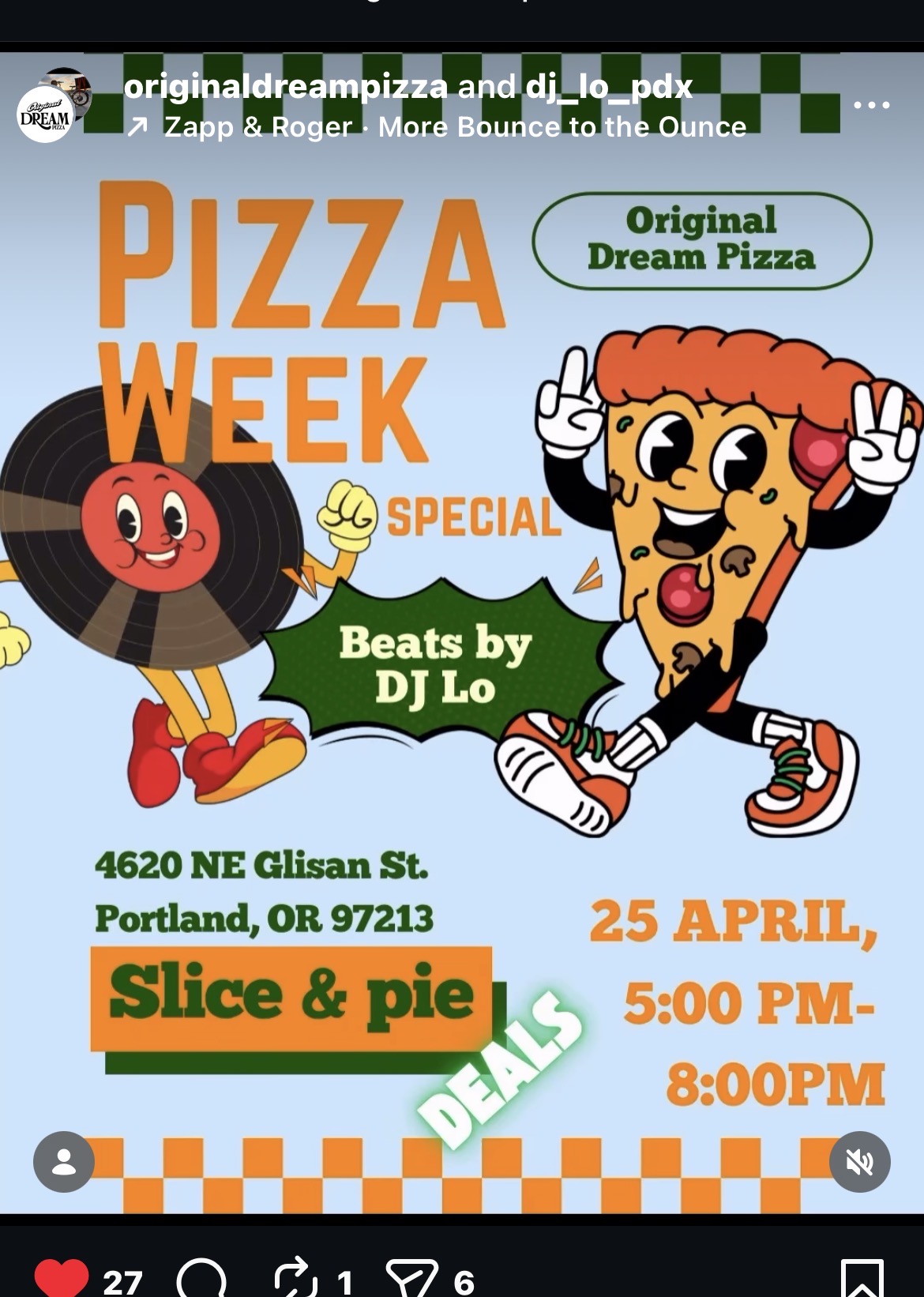 Original Dream Pizza are taking part in Pizza Week and have specials and such. We’re heading here because DJ LOPDX is playing there. DJ LOPDX has been an incredibly supportive part of the bike community for years and always comes through for others and here’s a chance for us to show a bit of love. Ride picks up after the HOD Cat Shelter ride. When we get to the Original Dream Pizza we will hang for a while and perhaps carry on the roe depending how folks feel.
