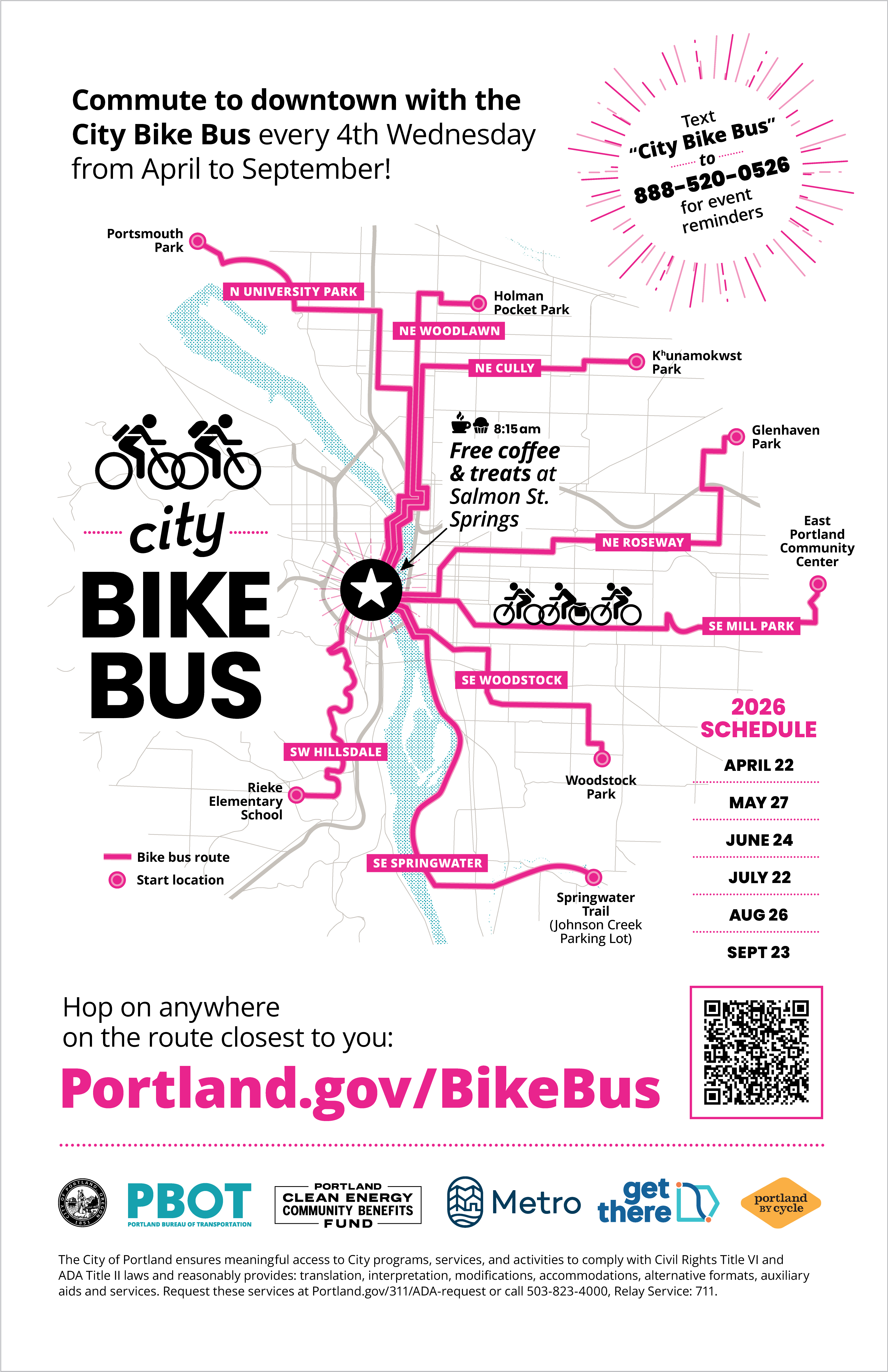 Commute with the City Bike Bus on Earth Day, Wednesday, April 22! Hop on your bicycle and join us on one of eight unique bike bus routes coming from all over the city into downtown. All bike bus ride leaders will have a pink vest and a bright lime green bandana tied to their handle bars for easy identification. At the end of the ride, we’ll all gather at Salmon Street Springs for a group photo at 8:15 a.m. and enjoy coffee, treats, and music! We'll also provide information on how to get involved with Bike Month, a month-long celebration of cycling all throughout May, where you can earn prizes just for riding your bike! Find out more about how you can take part in upcoming Bike Month events at portland.gov/transportation/walking-biking-transit-safety/bike-month-2026 Text "City Bike Bus" to 888-520-0526 to receive monthly Bike Bus reminders!